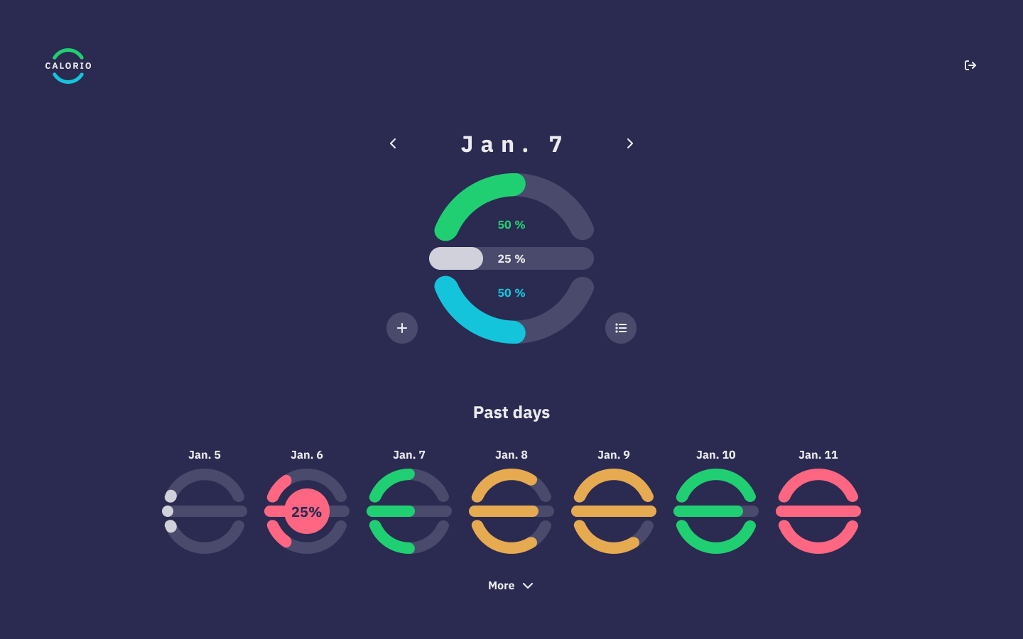 Part of the idea is to show progress each day along the three core metrics. But specifically with calories (food) we also have a rating system that flags foods based on their calory density. In our system we encourage foods that are heavy but low in calories, as these tend to be more natural and more filling. So our food meter shows a red, yellow or green color depending on the average rating for the foods logged, while each food items is colored accordingly.